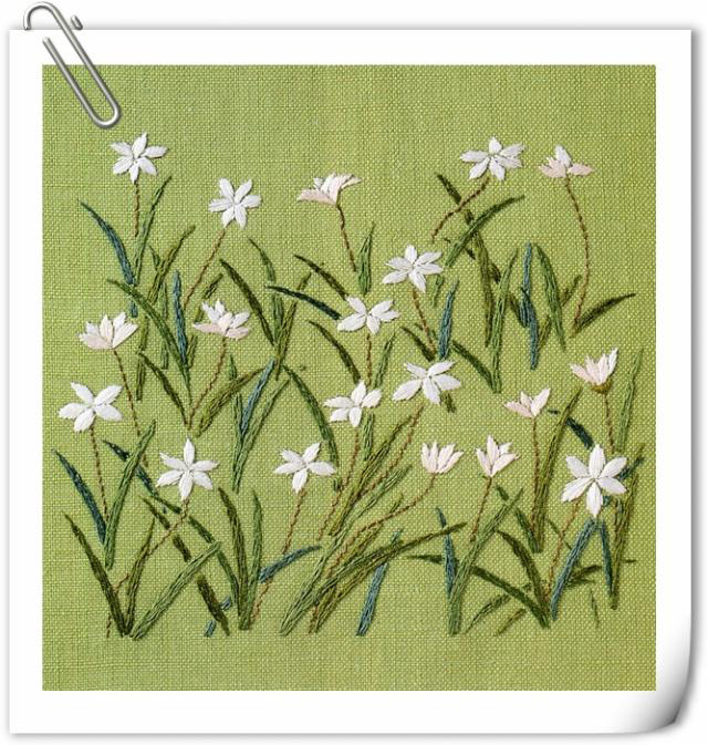 這種花兒叫韭菜蓮,每年六月到九月的時(shí)候就會(huì)開出很多很多潔白如玉的小花兒。把它繡在亞麻布上,是