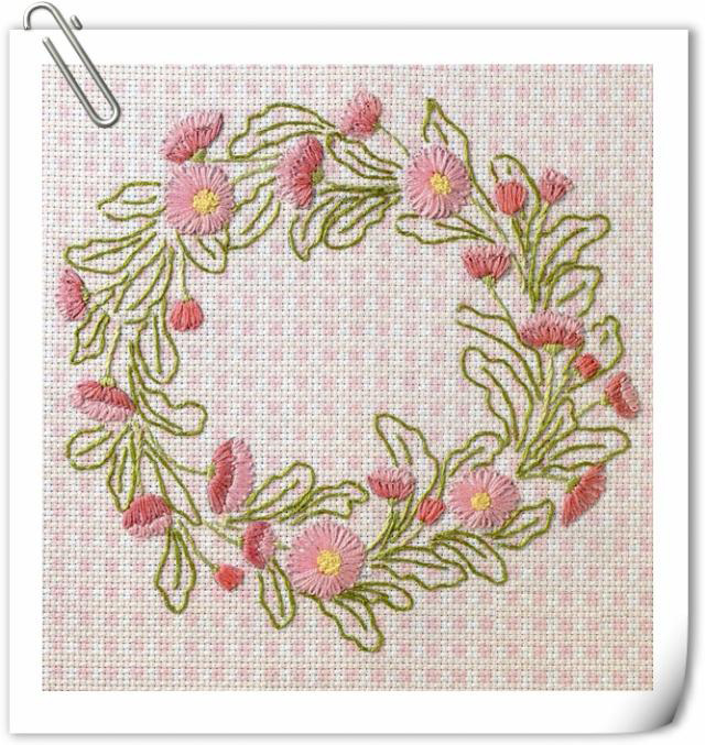 這個(gè)美麗的花環(huán),展現(xiàn)了多種刺繡針法。