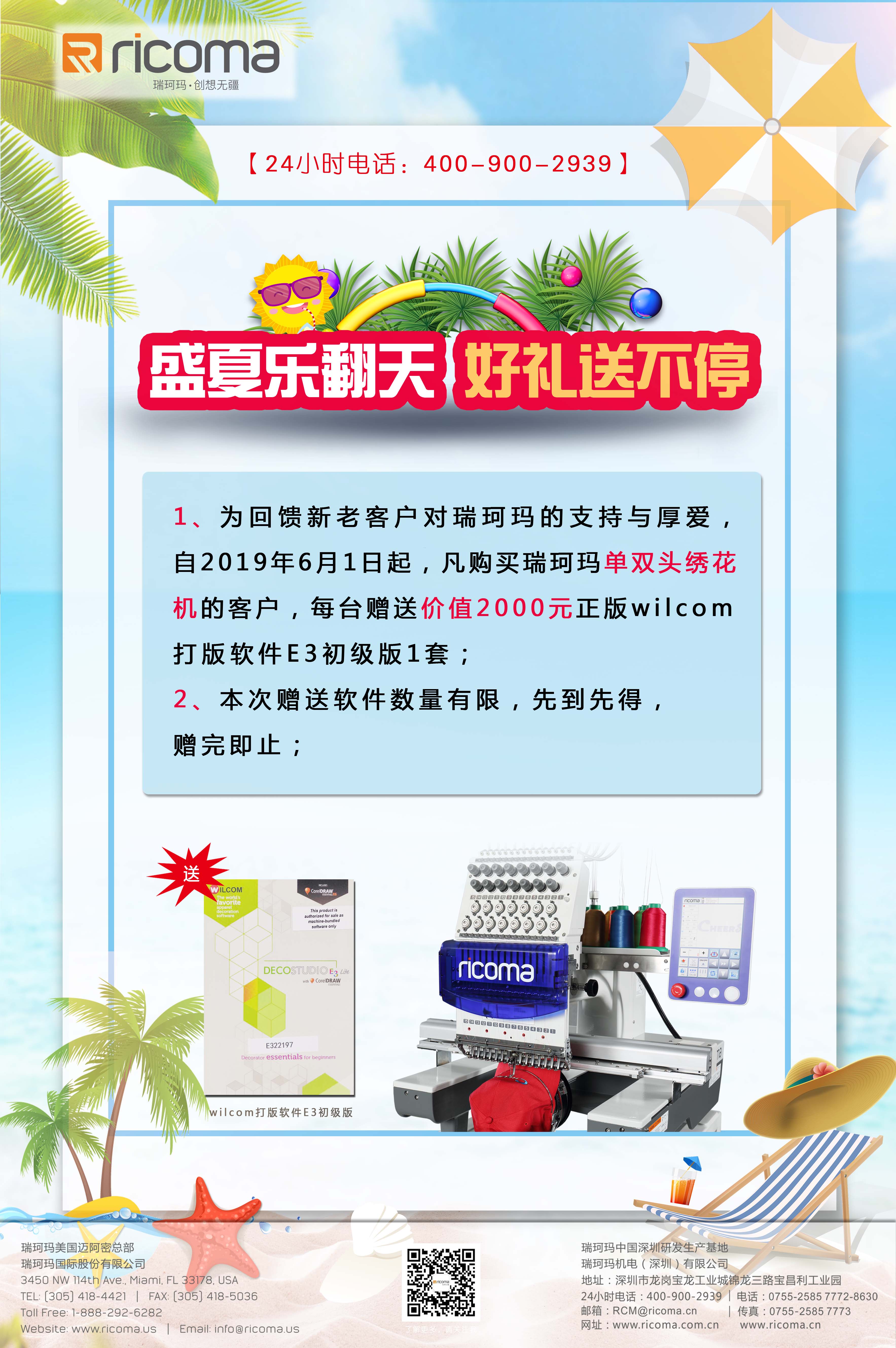 1、為回饋新老客戶對瑞珂瑪的支持與厚愛,自2019年6月1日起,凡購買瑞珂瑪單雙頭繡花機的客戶,每臺贈送價值2000